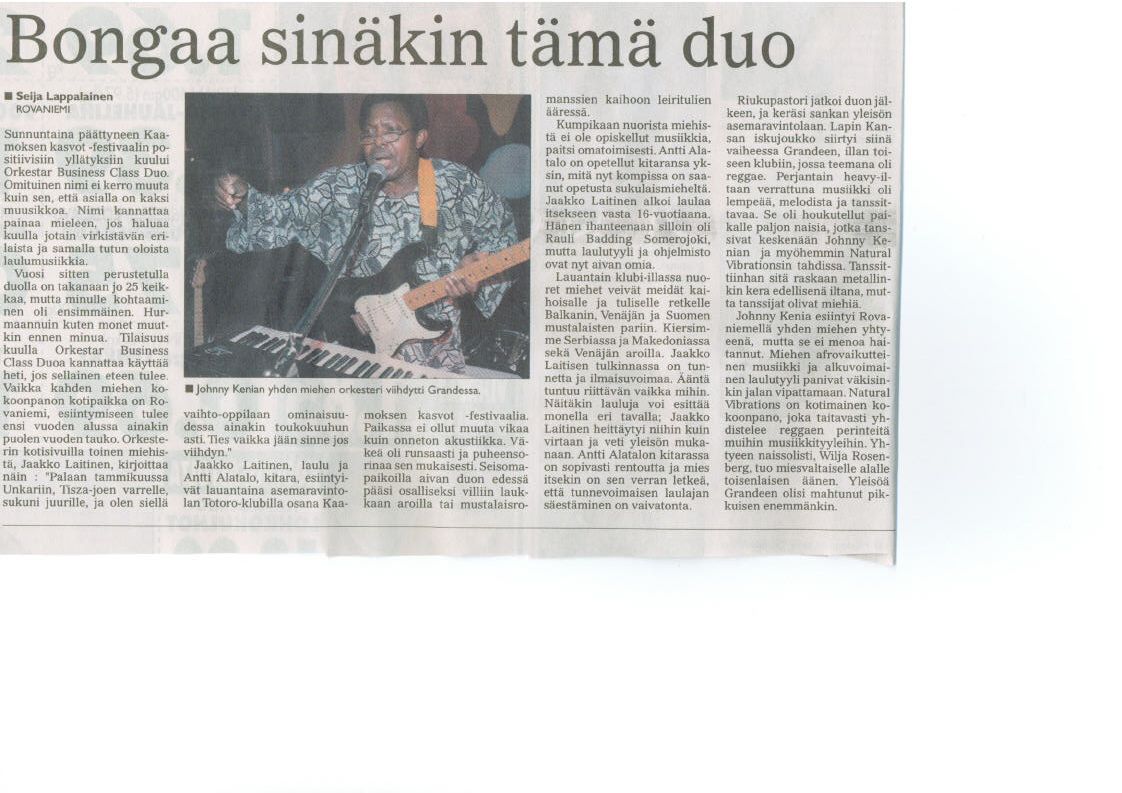 Koe omin silmin ja korvin Orkestar Business Classin loistokkuus: MYSPACE Tuoreimmat Orkestar kuulumiset löytyvät Orkestar Business Class Myspace-tilasta! MP3 Orkestar Business Class Duo (2005) - Rosmariini Orkestar Business Class Duo (2005) - Ajde Jano VIDEO Orkestar Business Class Duo - Rosmariini KUVIA Rovaniemeltä, Häistä, Jyväskylästä ja Galleriasta. JUTUT Jaakko Laitisen (Orkestar Business Class) haastattelu - Vastapaavi - 3.11.2007 "Orkestar Business Class on rohkeasti slaavilainen" - Lapin Ylioppilaslehti - 6/2007 (s. 16) Iskelmää omankädenoikeudella - Uusi Rovaniemi - 21.2.2007 Vapauden, rakkauden ja ystävyyden viesti - Kirjava silta - 20.2.2007 Laulun siivin mutta liikemiesluokassa - Kaltio - 5/2006 Bongaa sinäkin tämä duo - Lapin Kansa - 14.11.2005 "Pelottavan hyvää musiikkia" - Lapin Ylioppilaslehti - 5/2005 TUOTANTO Orkestar Business Class Duo: Ennen Maanpakoa -ep (2006) Sisältää rallit: 1. Rosmariini 2. Ajde Jano 3. Mistähän ne kaaleet oli suuttununna meille 4. Duj sandale 5. Kiidä troikka 6. Chaje shukare |